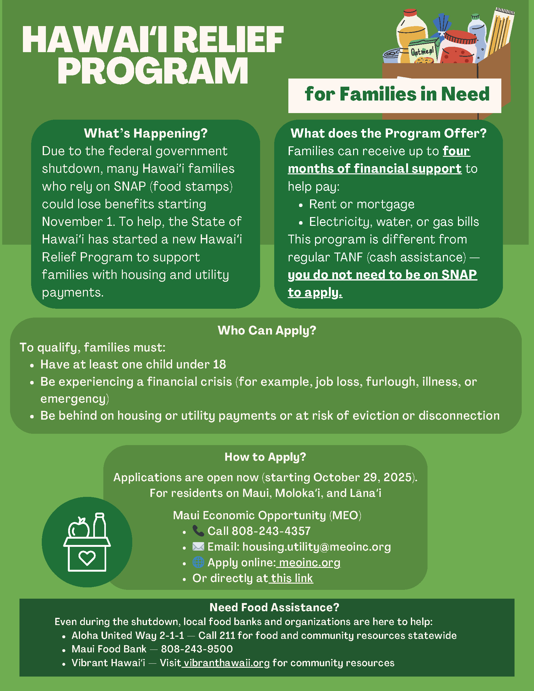 - How can a family get more information about the housing and utility payments and the Hawaiʻi Relief Program?